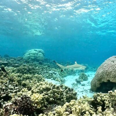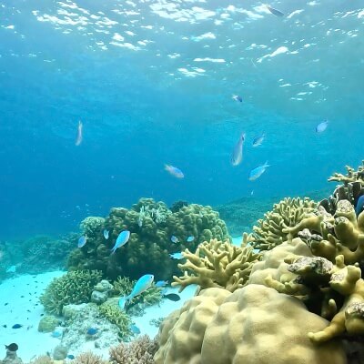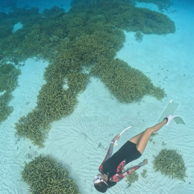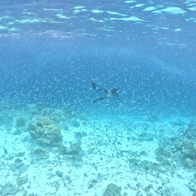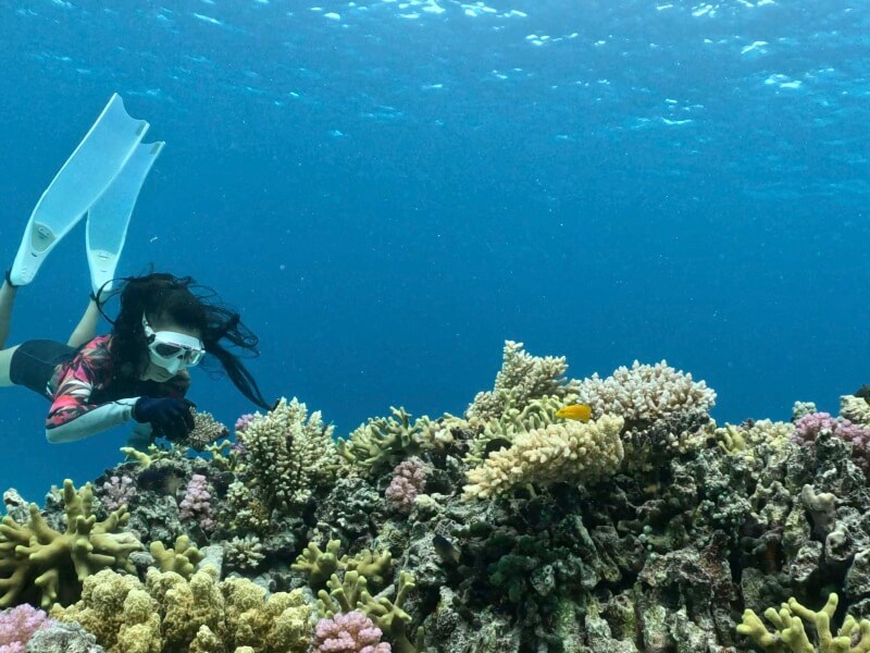 天候によっては肌寒いときがあるのと、サンゴや岩でかなりゴツゴツしてる場所がある