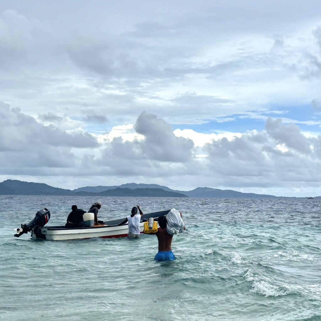 朝より風が強くなってきて波のパワーも出てきたけど、慣れたように荷物を運びこむ皆の姿がすごい。